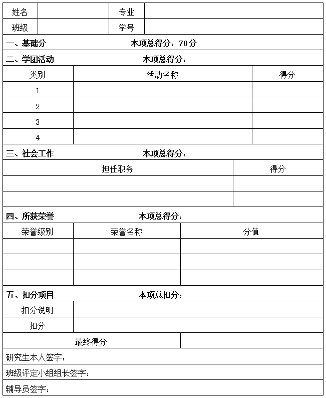 研究生学业奖学金德育成绩评分表