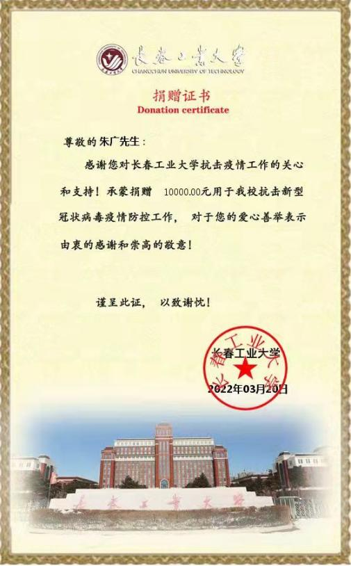 以朱广、黄冬、马庆瑞、宋小华、方毅、刘锐、谢亚男为代表的各级校友和社会各界人士向学校、学院捐款捐物。各位校友慷慨捐赠母校的善举,充分体现了校友感恩母校、心系母校师生的深情厚谊,温暖了整个校园。学院教师和同学们心系学校积极参与捐款活动,同时为抗击吉林疫情自发地向吉林省红十字会和长春市红十字会献出自己的爱心。