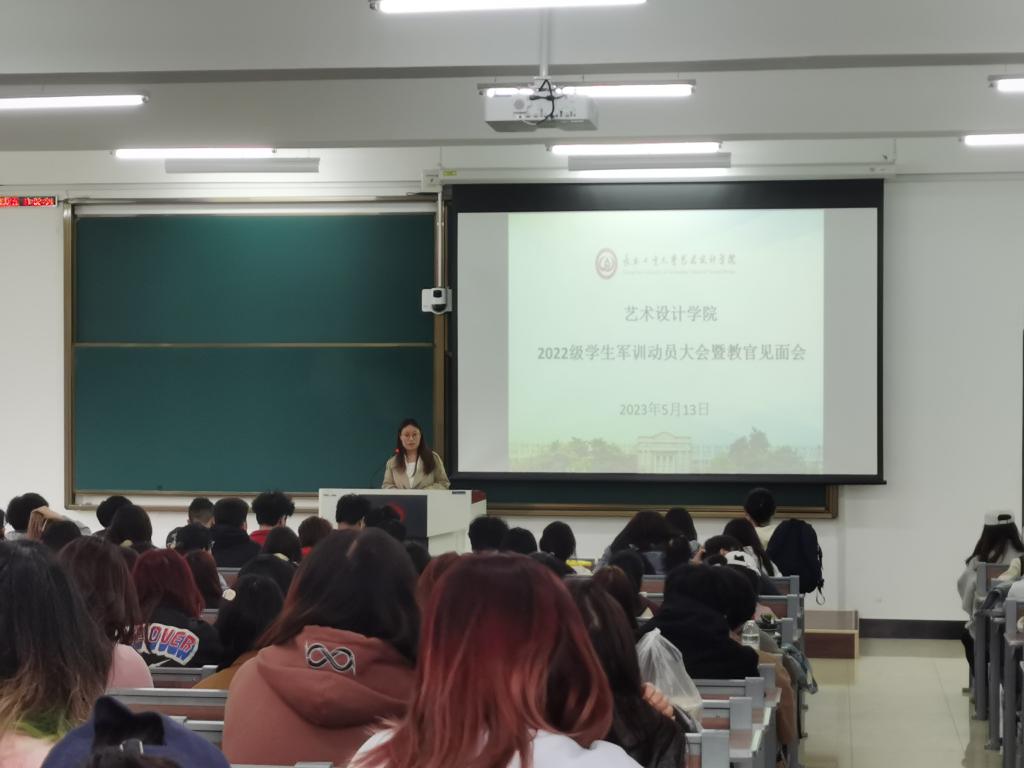 于5月13日在艺术楼一楼阶梯教室召开2022级学生军训动员大会暨教官见面会,学院党委副书记刘坤、辅导员助理苏文敏、承训教官范馨元、孟庆安、郭强出席会议,2022级全体学生参加会议。