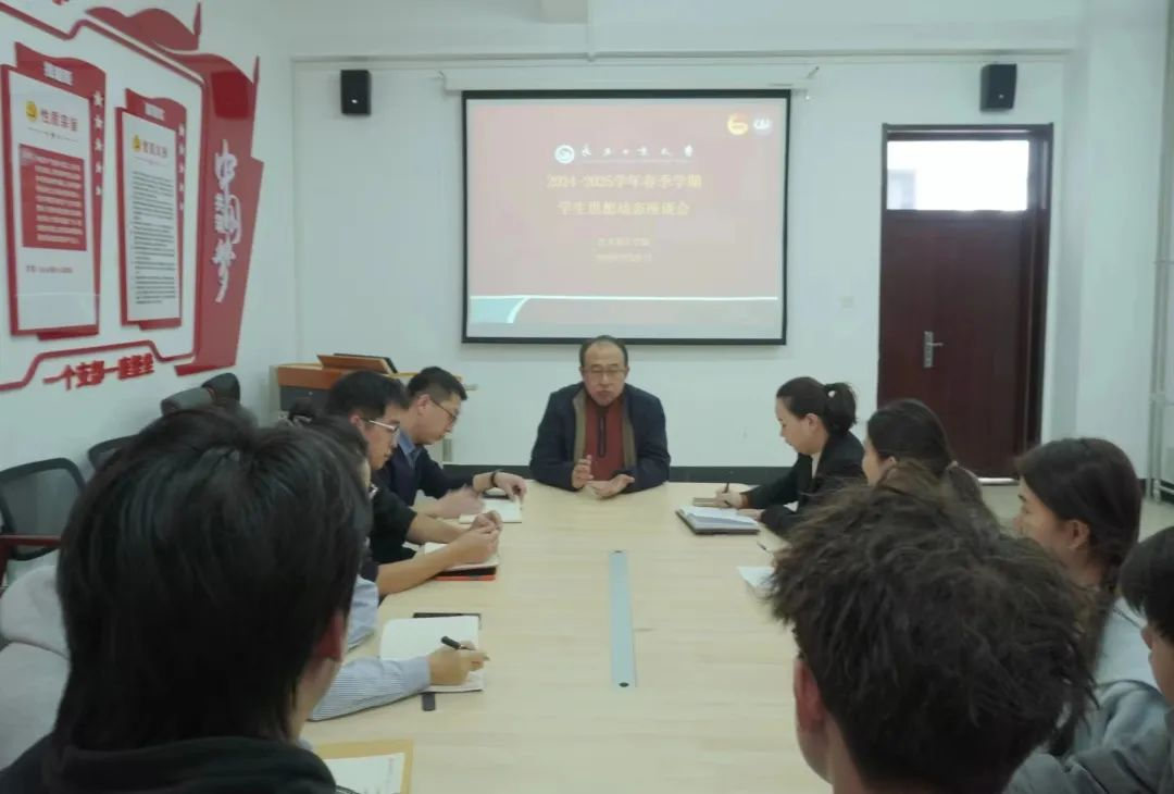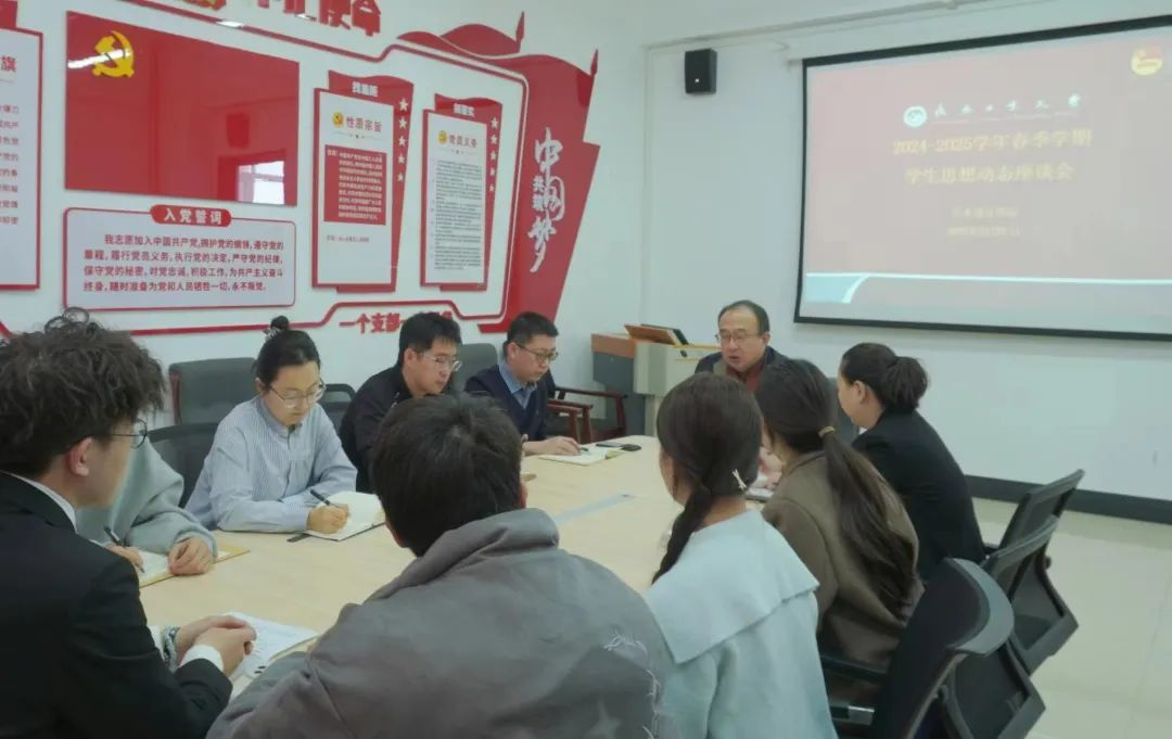 在艺术楼302会议室召开2024 - 2025学年春季学期学生思想动态和学风建设座谈会。学院党委副书记楚玉彪,专职组织员董广通,学生党支部书记于丰硕,研究生党支部书记尚彤出席会议,会议由学院团委书记侯天放主持。
