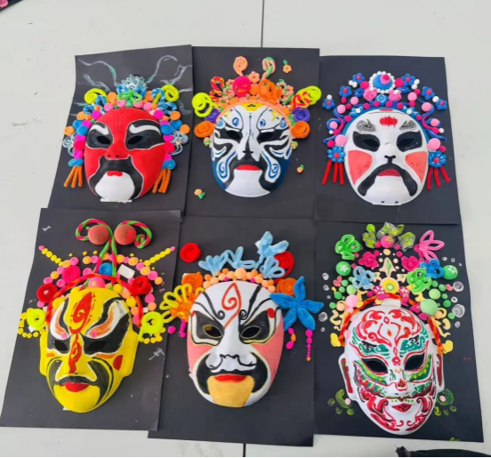 活动现场,学生志愿者现场讲解京剧脸谱的谱式规律与文化内涵。学生们通过揉泥、塑形、勾线、敷彩等工序,创作出融合大刀、烽火、长城等抗战元素的现代脸谱作品。红色主调的《忠魂》、蓝金交织的《砥柱》等作品,既保留戏曲程式化特征,又创新融入革命叙事,赋予非遗艺术新的时代表达。