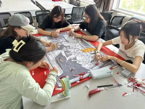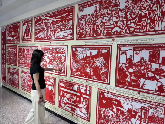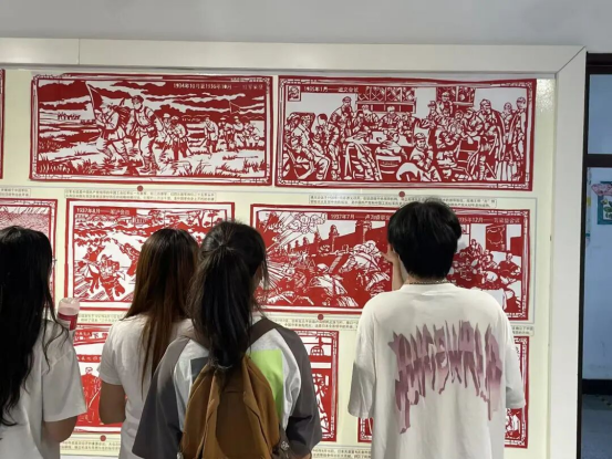此前由“艺航社”创作的14组、总长近10米的剪纸巨作再次亮相。作品生动呈现了从九一八事变到全面抗战胜利的关键历程。现场,讲解员为同学们深情解读每幅作品背后的历史事件与民族记忆,引导大家深切感受那段烽火岁月中先烈们的牺牲与奉献。