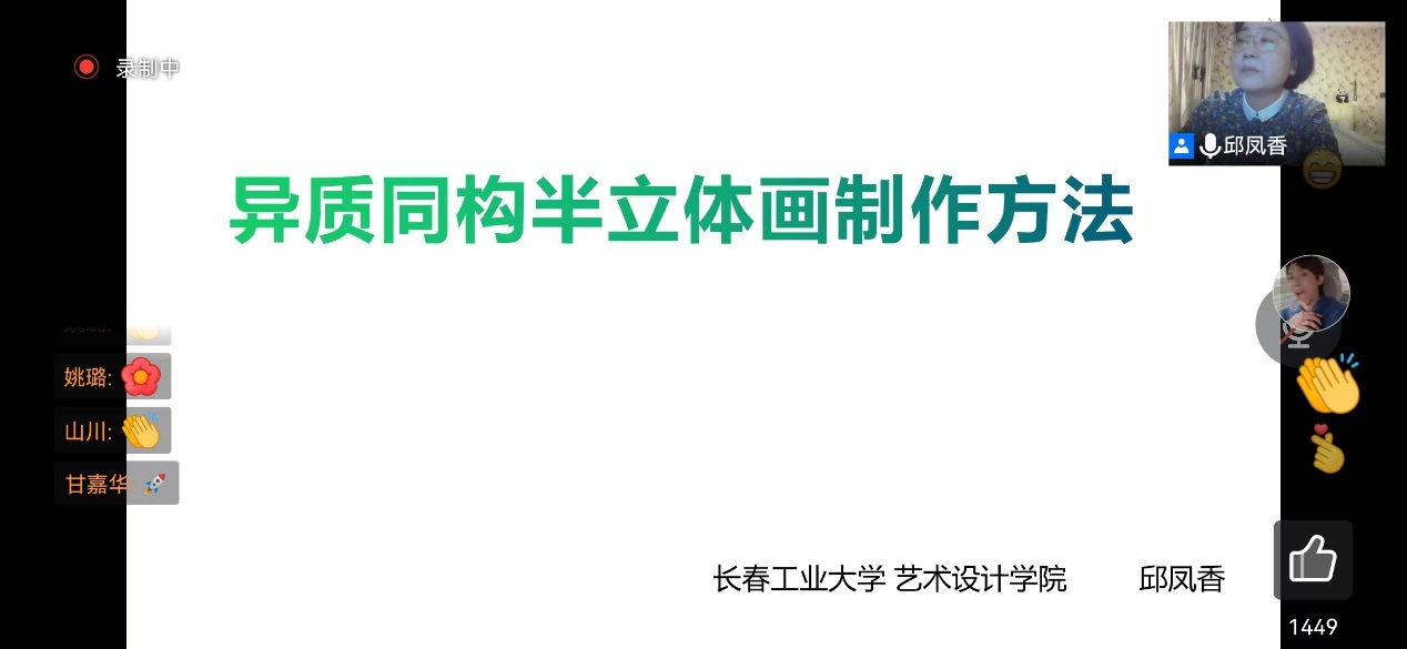 4月7日晚19:00时,第七讲《异质同构半立体画制作方法》由艺术设计学院邱凤香老师主讲。邱凤香老师以异质同构半立体画作品云展览开篇,介绍了异质同构的原理以及画面处理中需要注意的色调、突出主体形象等问题。最后以视频演示的形式完成了一幅精品画作。
