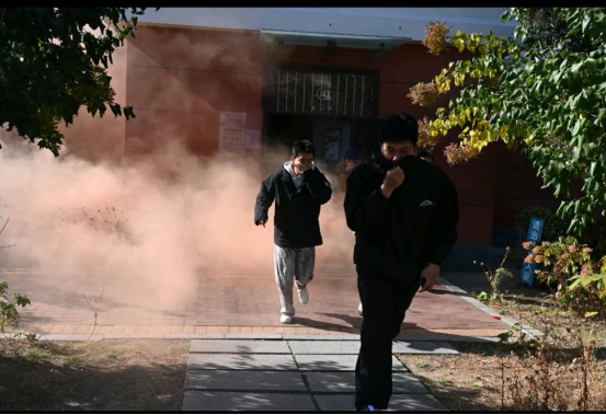 演练前,参演学生12:35在宿舍内等待指令发出,指令发出后同学们迅速响应,严格按照消防演练规范要求,俯身低姿、捂住口鼻,沿宿舍东侧与东北侧两个出口有序、快速疏散。整个过程组织严密、行动高效,参演学生沉着冷静、互帮互助,无推搡、拥挤、嬉闹等现象,展现出良好的纪律意识和消防安全素养。