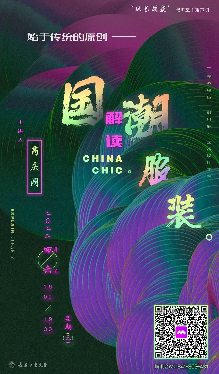 4月6日晚19:00时,第六讲《始于传统的原创——解读“国潮”服装》由艺术设计学院教师高庆阁老师主讲。云端200余人共同观看讲座,高庆阁老师从“国潮”的定义、缘起、发展入手,通过品牌发布会和成衣风格进一步解读 “国潮”在当今世界时尚圈发挥的重要作品。讲座现场热烈,受到广大师生的好评。
